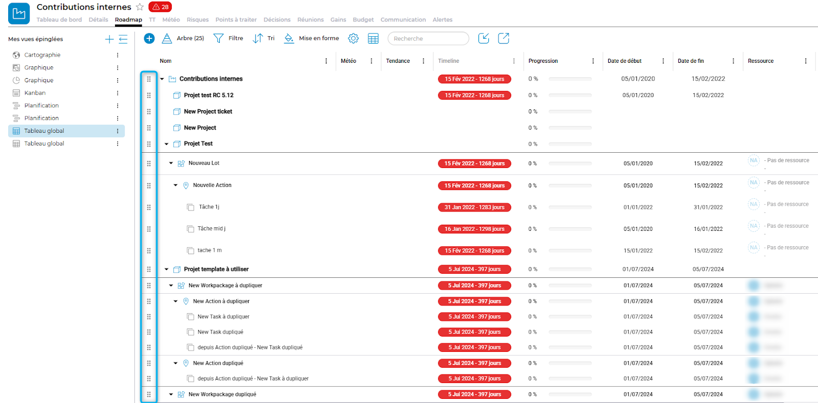 La planification d’un projet nécessite souvent des ajustements réguliers dans la structure hiérarchique : déplacer un projet dans un autre portefeuille, réorganiser les actions dans un lot, repositionner une tâche au bon endroit, etc.