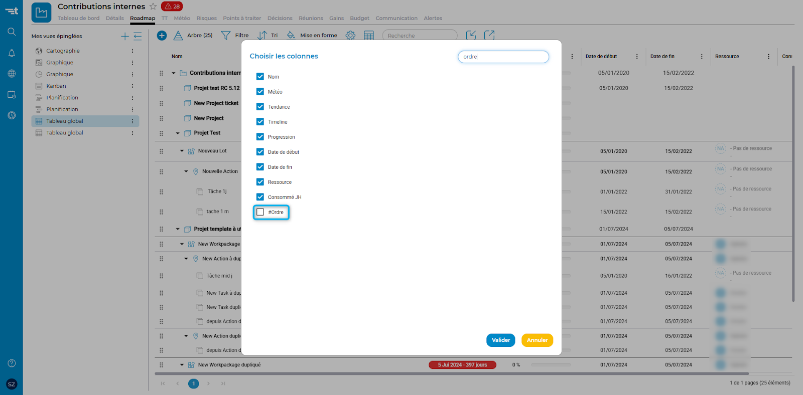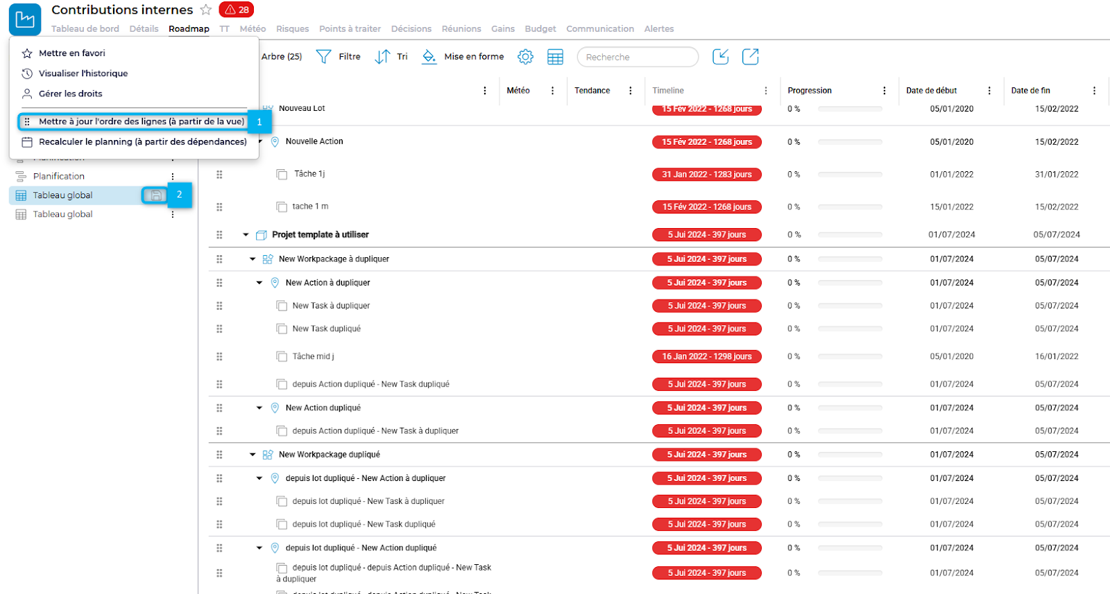 - Changer l’ordre d’affichage de vos éléments dans la Roadmap (projets, lots, actions, tâches).